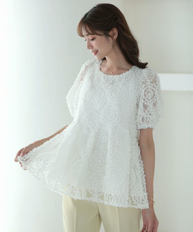 フラワーモチーフチュールトップス チュール 半袖 パフ袖 裾フレア ペプラム ブラウス トップス レディース フラワーモチーフチュールトップス チュール 半袖 パフ袖 裾フレア ペプラム ブラウス トップス レディース 春 夏【m783】【即納:1~2日以内に発送予定(店舗休業日を除く)】【送料無料】メ込