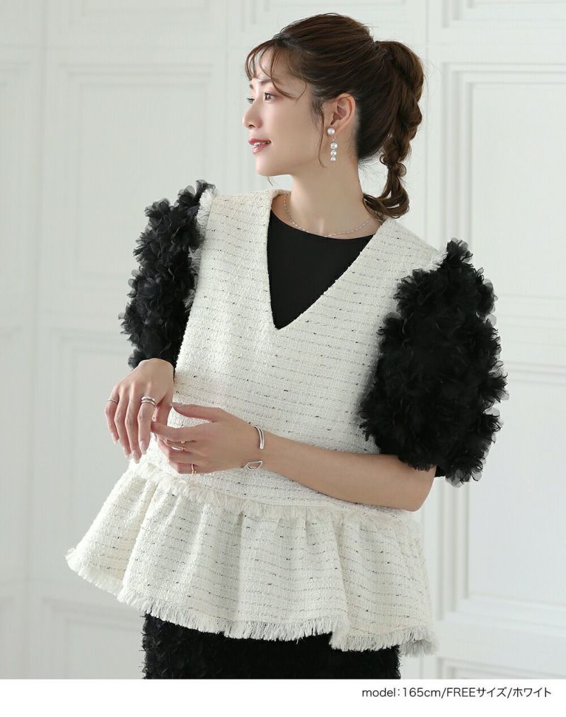 ツイードジレ ベスト フリンジ Vネック 裾フレア ペプラム トップス レディース ツイードジレ ベスト フリンジ Vネック 裾フレア ペプラム トップス レディース 春 夏【m753】【即納:1~2日以内に発送予定(店舗休業日を除く)】【送料無料】メ込