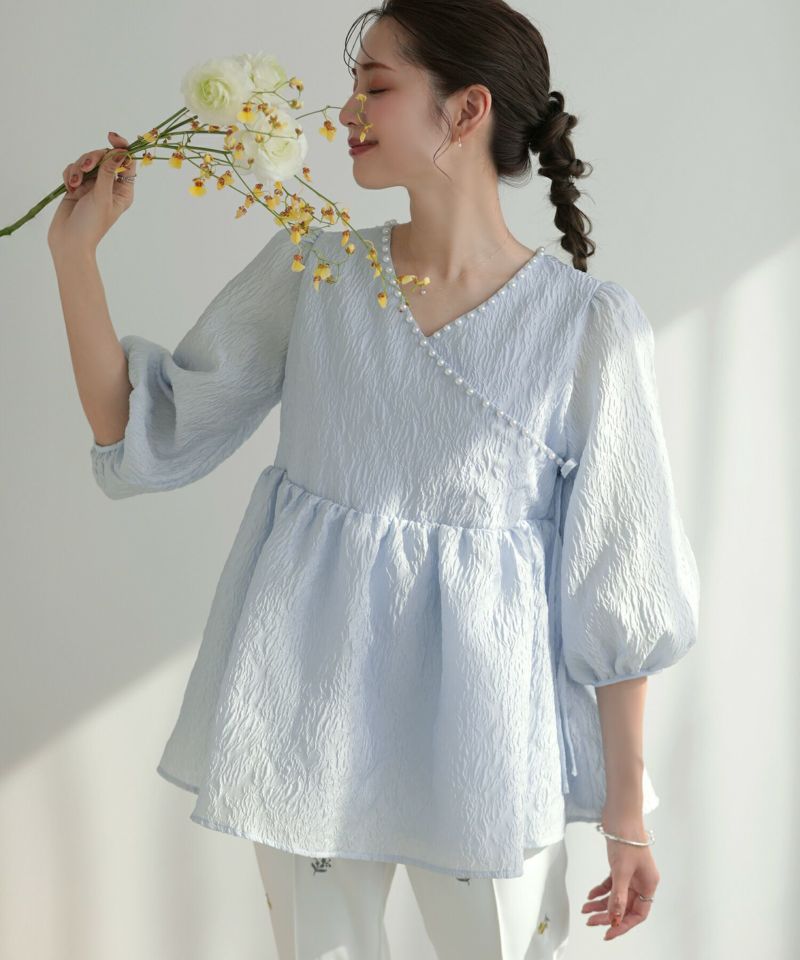 シアージャガードパールブラウス ブラウス シアー ジャガード パール ペプラム 裾フレア バルーン袖 七分袖 トップス レディース シアージャガードパールブラウス ブラウス シアー ジャガード パール ペプラム 裾フレア バルーン袖 七分袖 トップス レディース 春 夏【m826】【即納:1~2日以内に発送予定(店舗休業日を除く)】【送料無料】メ込